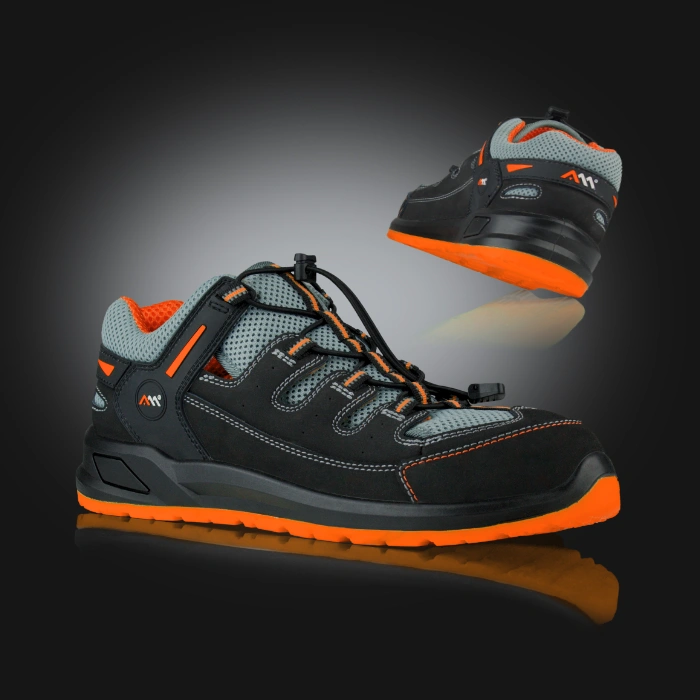 - cholewka wykonana ze skóry nubuk oraz dzianiny siateczkowej mesh w kolorze szarym i pomarańczowym, dodatki w kolorze pomarańczowym, zwiększają atrakcyjność wizualną buta,